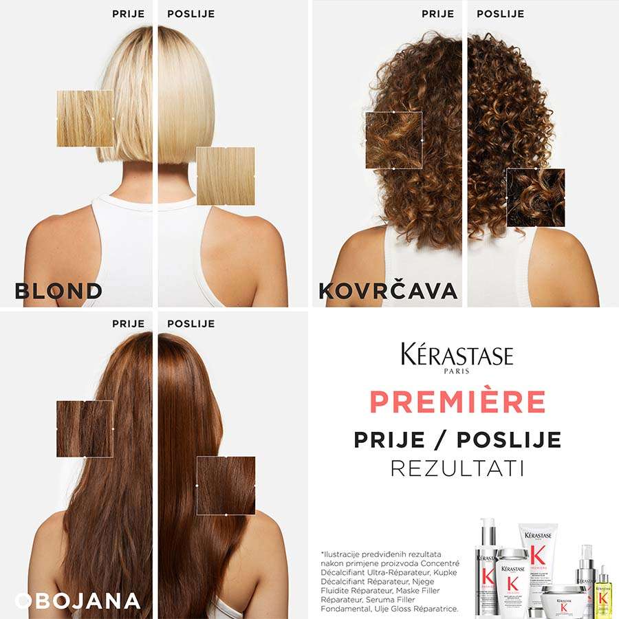 Iskoristite snagu slojevitog nanošenja za maksimalne rezultate. Počnite sa snažnom dozom aktivnih sastojaka iz Kérastase Premiere predtretmana, a zatim operite kosu Kérastase Premiere kupku za jaku, sjajnu i glatku kosu. Masku koristite dva puta tjedno kako biste pojačali učinak. Vaši Kérastase Première proizvodi zajedno djeluju za dodatnu obnovu i njegu s dekalcifikacijom.