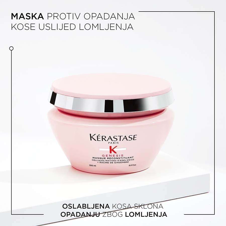 Genesis Masque Reconstituant Hair Mask je maska protiv opadanja kose koja jača i obogaćena je izvornim stanicama Edelweissa, korijenom đumbira i Aquaxylom koji intenzivno njeguje, raspetljava i jača kosu kako bi se smanjio rizik od opadanja kose zbog lomljenja.