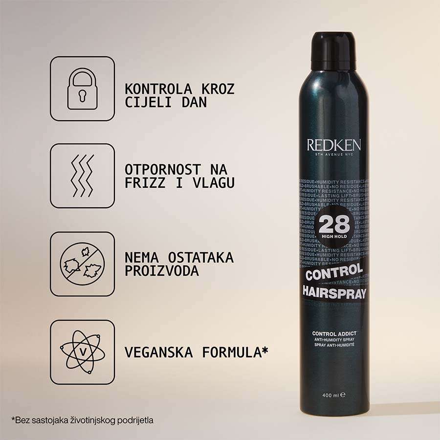 Redken Control lak za kosu pruža maksimalnu kontrolu tijekom 24 sata bez ljepljivih ili ljuskavih tragova. Ovaj sprej protiv vlage čini kosu lagano i održava frizuru u savršenom obliku, zadržavajući prirodno kretanje i olakšavajući češljanje. Također štiti kosu od vlage i učinkovito sprječava neželjeno kovrčanje. Za besprijekoran izgled tijekom cijelog dana!